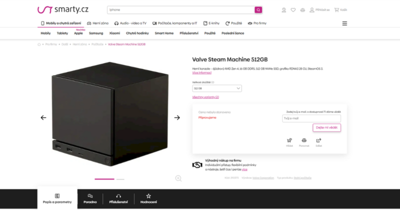 AlzaのSteam Machine商品ページを調べたところ、Smarty.czとほぼ同じ価格構造が確認されたとのこと。